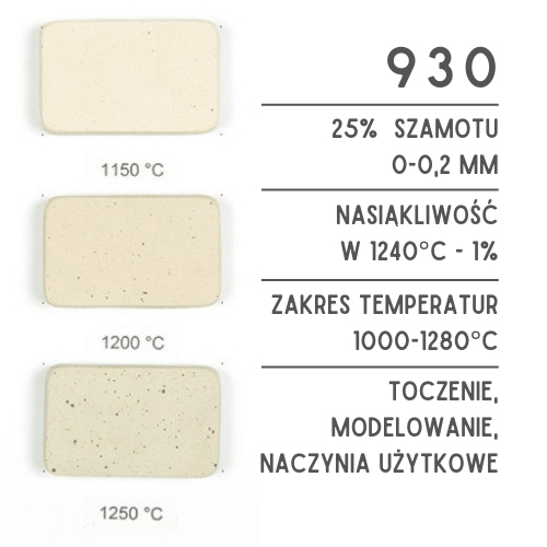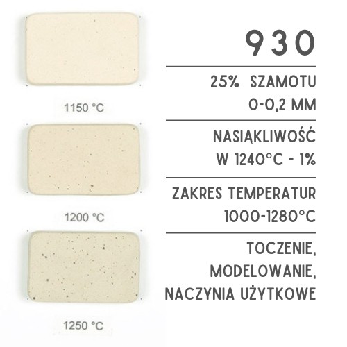Zawartość drobnego szamotu czyni tę masę bardzo uniwersalną. Nadaje się zarówno do lepienia, jak i toczenia. Świetnie sprawdzi się jako glina dla osób początkujących i podczas pracy z dziećmi. Po wypaleniu ma kremowy kolor w ciemniejsze kropki.