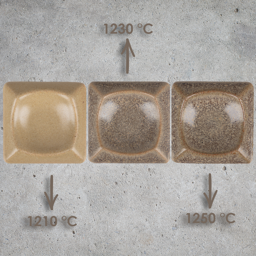 Wizualny efekt końcowy szkliwa zależny jest od wielu czynników: sposobu aplikacji, krzywej wypału, atmosfery w piecu (szkliwa mogą wpływać wzajemnie na siebie). Zalecamy wykonanie wcześniejszych próbek.