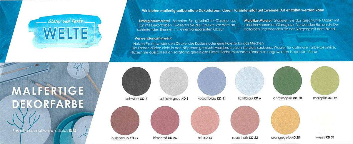 Do dekoracji wyrobów ceramicznych oferujemy kompletną gamę wysokiej jakości farb dekoracyjnych KDM. Wszystkie kolory można ze sobą swobodnie mieszać, co pozwala uzyskać szeroką paletę odcieni. Farby dostarczane są w formie kostek – dzięki bardzo drobnej granulacji są wyjątkowo wydajne.